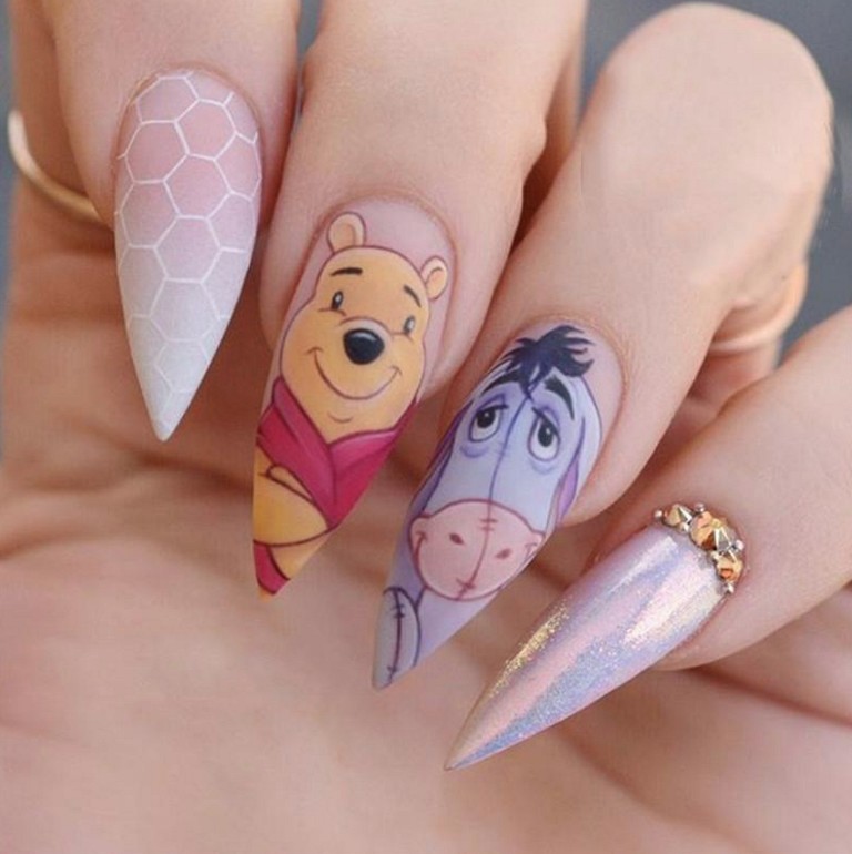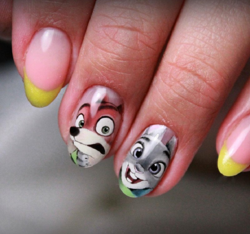 Но также возможен вариант с изображением на ногтевых пластинах миловидных и добрых персонажей, вроде Микки Мауса, Винни Пуха.