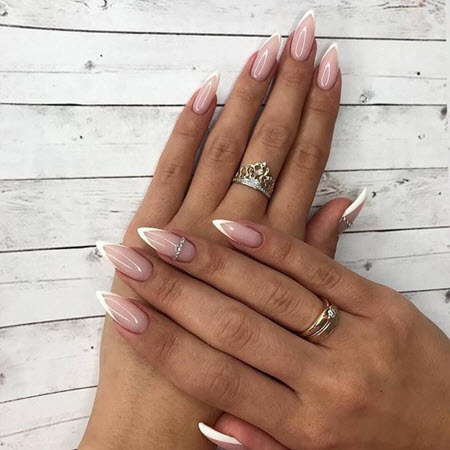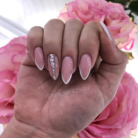 Свадебные – форма подойдет любая, но из рекомендаций: миндаль или стилеты. Они с легкостью дополнят любой образ. В качестве основы зачастую используется белый френч, к нему добавляются некоторые акценты: блестки, стразы или кружева. Все на усмотрение невесты с предупреждением: «не переборщить». Самым оптимальным будет оформление одного ногтя на каждой руке, оставив остальные в классическом варианте.