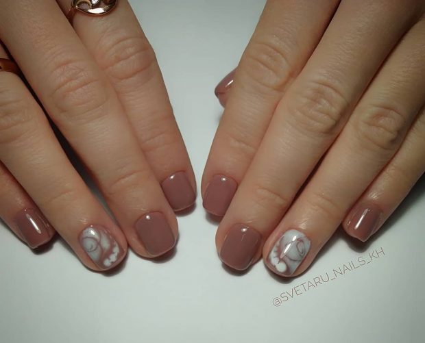 Нежный маникюр может быть оформлен весьма лаконично — воздушным однотонным покрытием. Также в дизайне для коротких ногтей уместно использовать цветочные или художественные орнаменты, различные узоры, декоративные элементы. Остерегаться нужно чересчур ярких акцентов, крупных страз и массивной лепки — с ними оформление ноготков может смотреться вычурно, грубо и не совсем удачно.