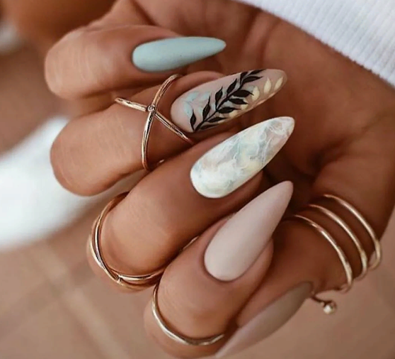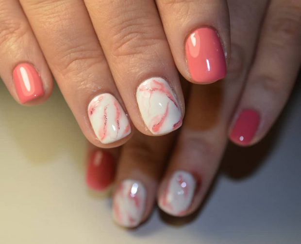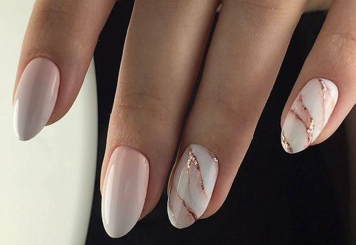 Мраморный дизайн ногтей с использованием нежных оттенков, таких как белый, бледно-розовый или светло-голубой, создает элегантный и модный вид. Это можно сделать с помощью специальных мраморных гель-лаков или техникой мраморного влажного маникюра.