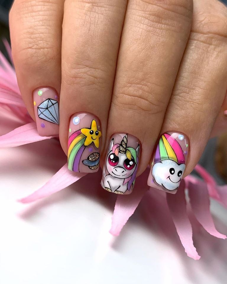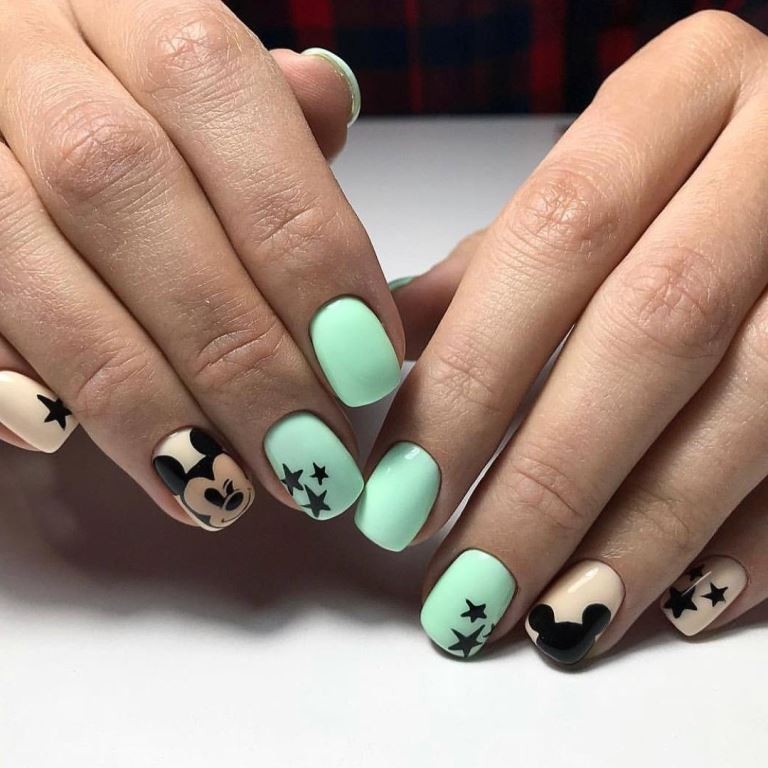 - Короткие. На таких ногтях лучше будет смотреться минималистичный маникюр без перебора, но с некоторыми акцентами. Поэтому можно украсить по одному ноготку каждой руки мультяшным рисунком, а остальные сделать однотонными, но выбирать слишком яркие цвета не рекомендуется.