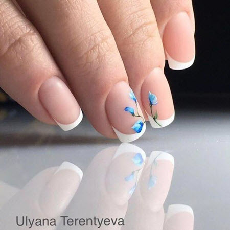 Тончайшие кружевные мотивы, цветочные композиции, необычные формы улыбки, блестящие полосы и сияние россыпи кристаллов также очень красиво подчеркнут френч и женственность ваших рук. Самые нежные идеи, смотрите на фото: