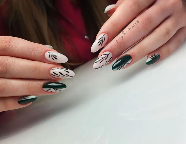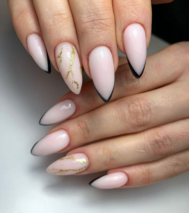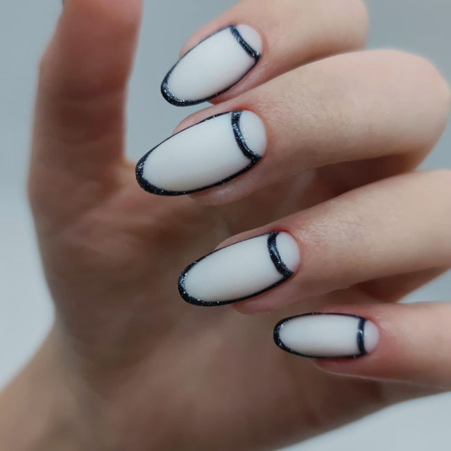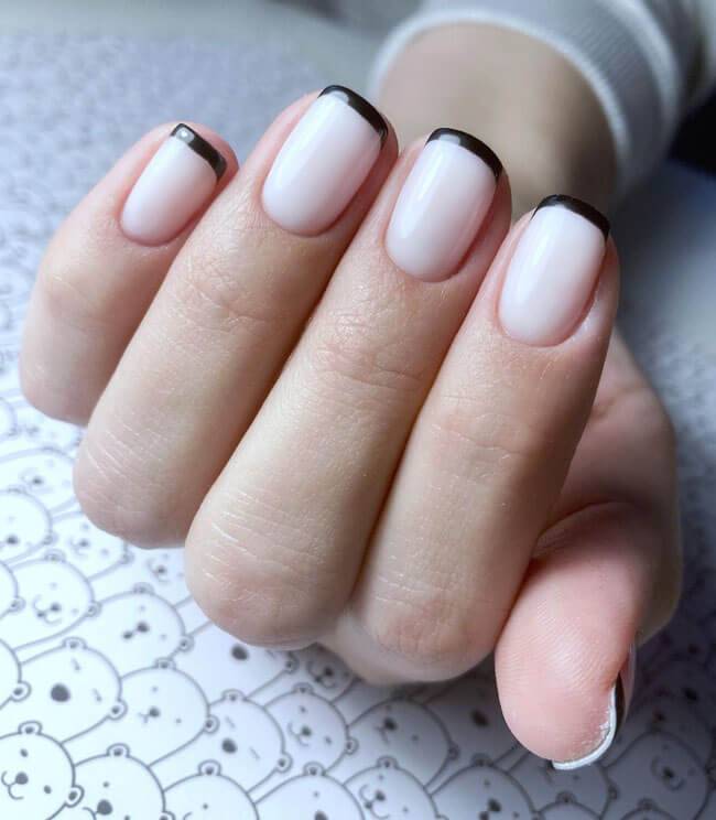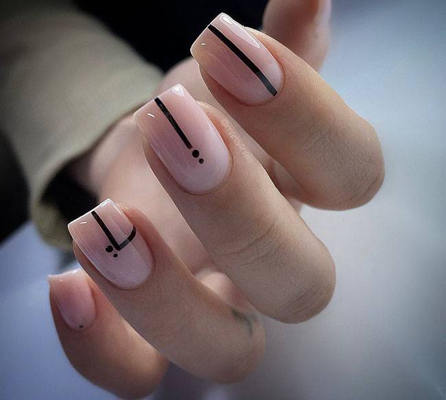 Черные рисунки также хорошо сочетаются с молочным маникюром. Даже простые узоры и точки выглядят гармонично и эффектно, если их нанести с помощью нюдового цвета и черного лака для ногтей.