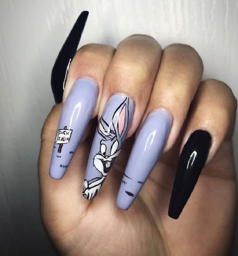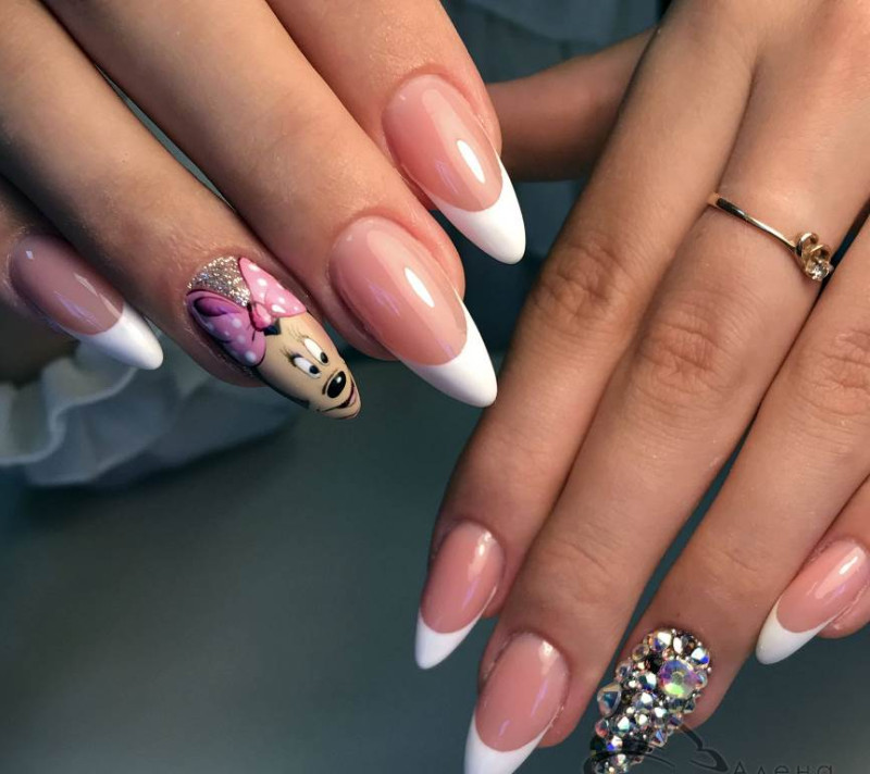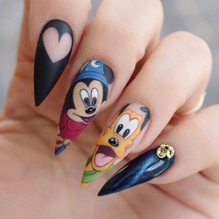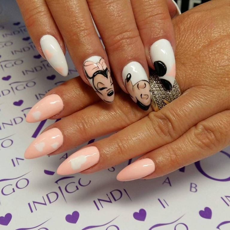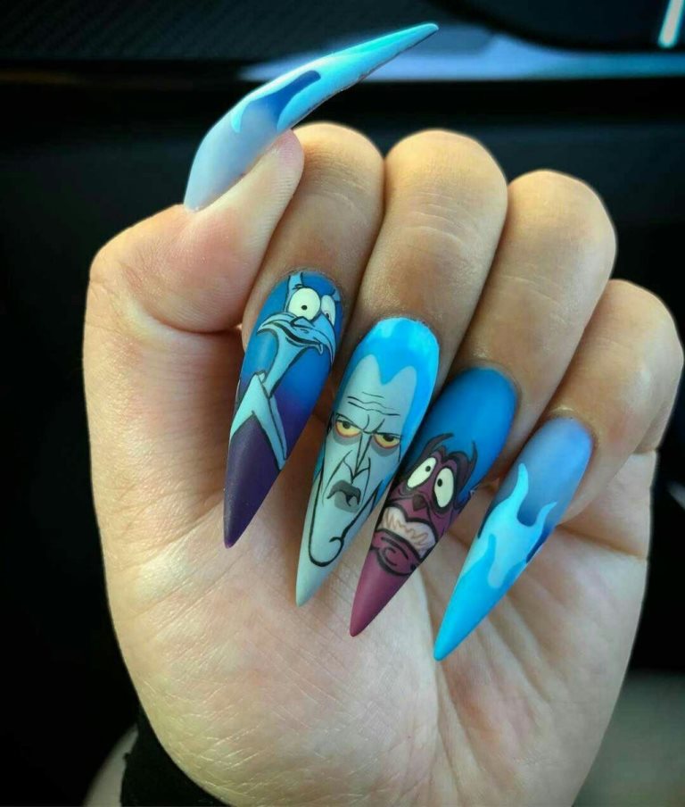 Но такие ногти можно сделать заостренными и тогда изящный маникюр превратится в дерзкий. В этом случае лучше всего смотрятся принты со злодеями из мультфильмов или абстракции.