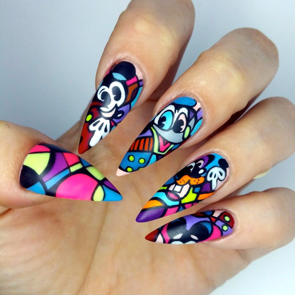 Но такие ногти можно сделать заостренными и тогда изящный маникюр превратится в дерзкий. В этом случае лучше всего смотрятся принты со злодеями из мультфильмов или абстракции.