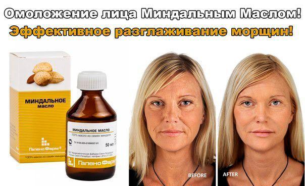 Масло миндаля больше других защищает кожу лица от образования морщин. Оно хорошо очищает поры, если применять его в теплом виде. Если использовать средство для снятия макияжа, то при этом разравниваются морщинки на лице и предотвращается возникновение новых. Препарат считается воздушным и легким, поэтому очень быстро впитывается.