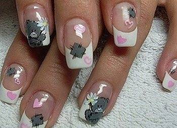 Плюшевые мишки отлично сочетаются с белым французским маникюром. Многие действительно привязываются к этим мягким игрушкам еще с детства. Медведей можно нарисовать в различных цветах — классическом коричневом, зимнем белом и сером! Но для этого конкретного нейл-арта, воспользуемся серым.