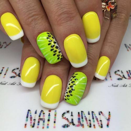 Вкусный маникюр лето может быть выполнен в ярких и насыщенных оттенках. В принципе, именно в таких оттенках и представлены в природе всеми любимые фрукты, которые мастера умудряются отобразить на ногтевой пластине.