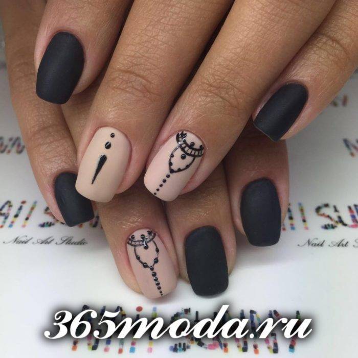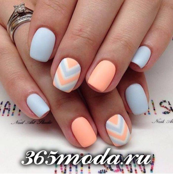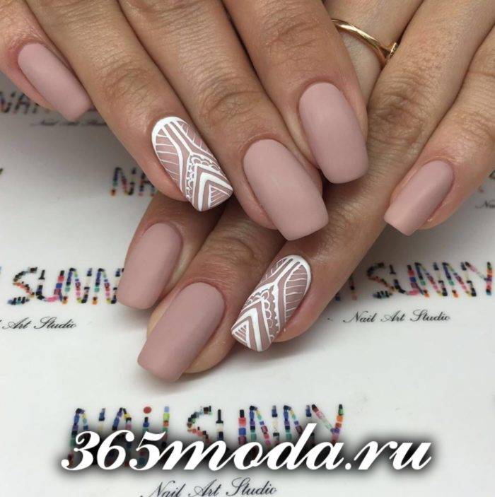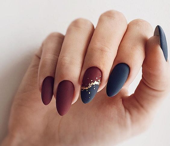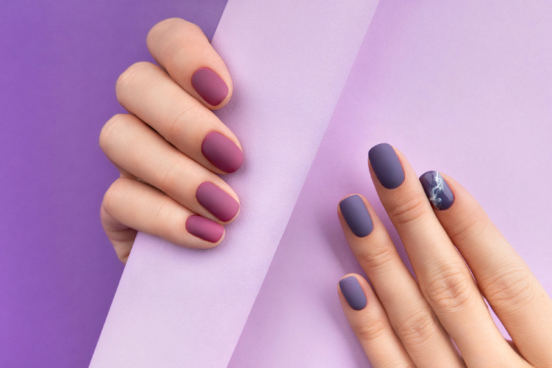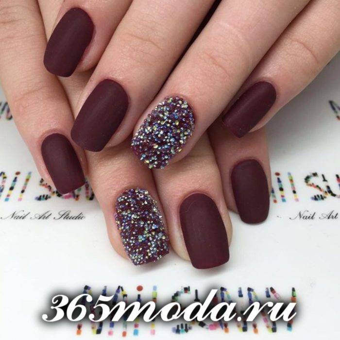 Маникюр невозможно представить без матовых ноготков. Эффект матовости можно сделать несколькими способами. Первый с помощью матового топа, который можно наносить на любой цвет и вы получите желаемый результат. Второй — матовый лак. Цветовая палитра таких лаков очень велика, самые модные из которых: красный, марсала, синий, изумрудный, фиолетовый, черный бежевый и другие.