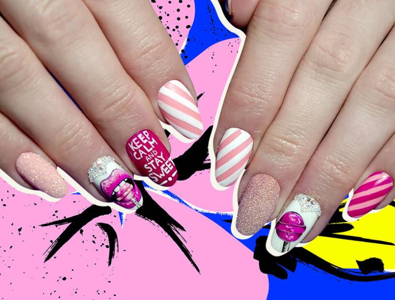 Частенько модный летний маникюр с вкусностями покрывают капельками, стразами, добавляя особый эффект в дизайн ногтей.