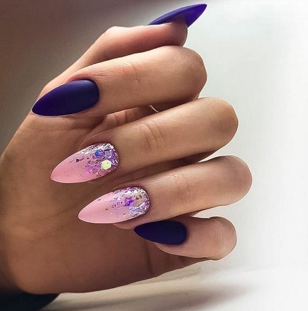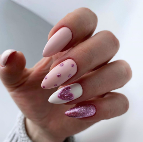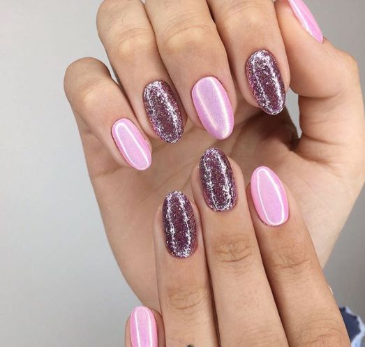 Красиво выглядят лунки с блестками в комбинации с розовым лаком.