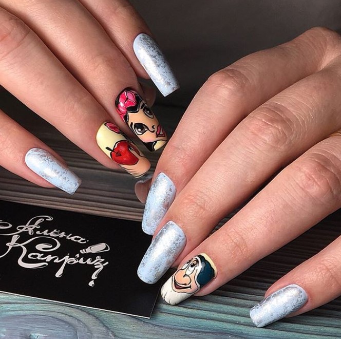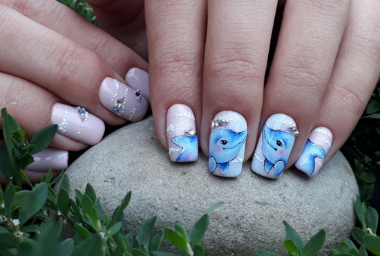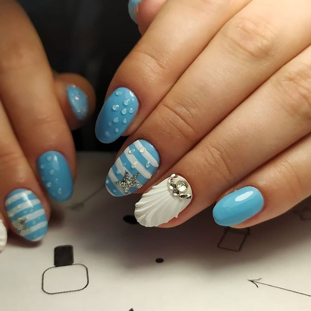 Ногти синего и голубого оттенков схожи с морскими волнами. Приевшиеся полосы и якоря впору заменить на принты морских звезд, кораллов, морских коньков и ракушек. Летний нейл-арт с морскими мотивами приведет в восторг любую модницу.