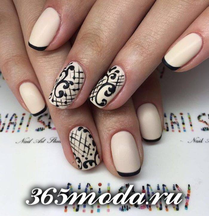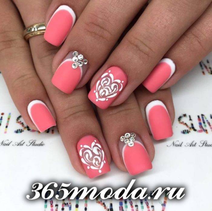 Очень интересно смотрятся дизайны, сочетающие в себе матовую и глянцевую или матовую и блестящую поверхности. Используя эту тенденцию очень необычно будет выглядеть френч и лунный маникюр, а также объемные дизайны с лепкой, витиеватыми узорами и т.д.