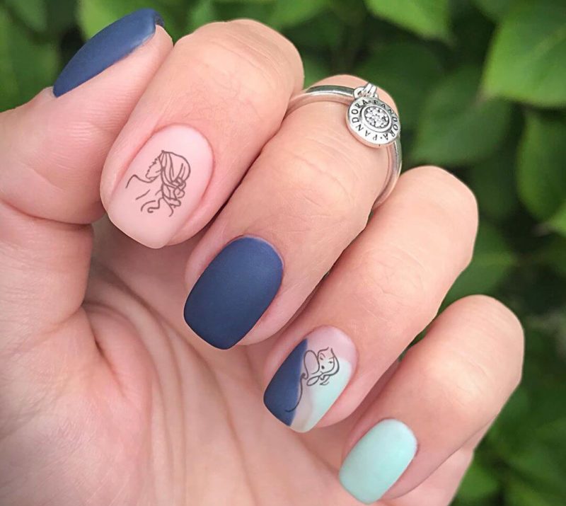 За основу можно взять и пастельные тона, главное внимание стоит уделить именно деталям, таким как добавление блесток, акриловых красок, декоративного песка в дизайн. Также придать оригинальности маникюру можно с помощью стемпинга и трафаретов, для их нанесения рекомендуется использовать такие оттенки как мята, изумруд, персик, небесный, розовый или сиреневый