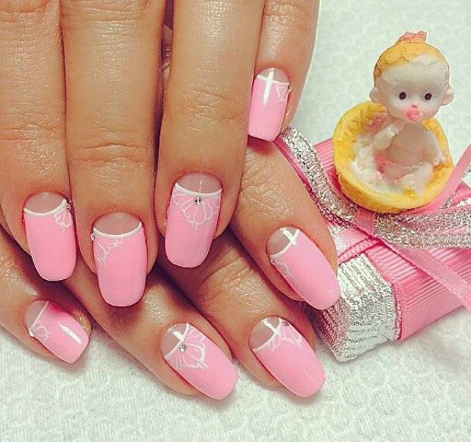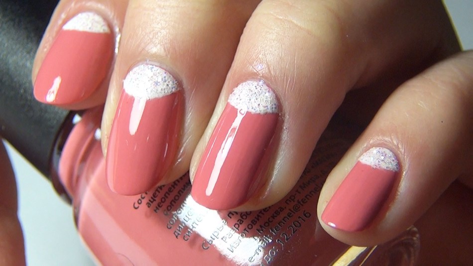 Красиво выглядят лунки с блестками в комбинации с розовым лаком.