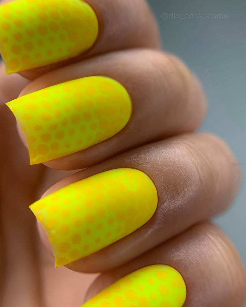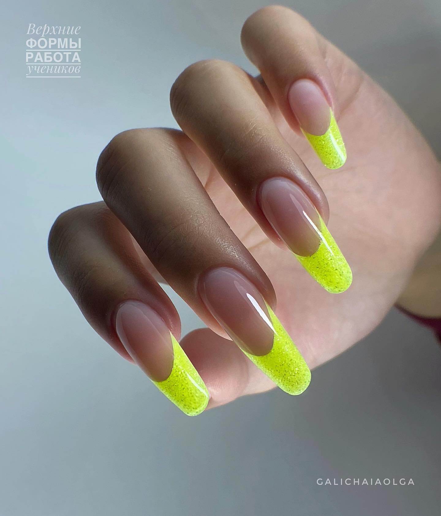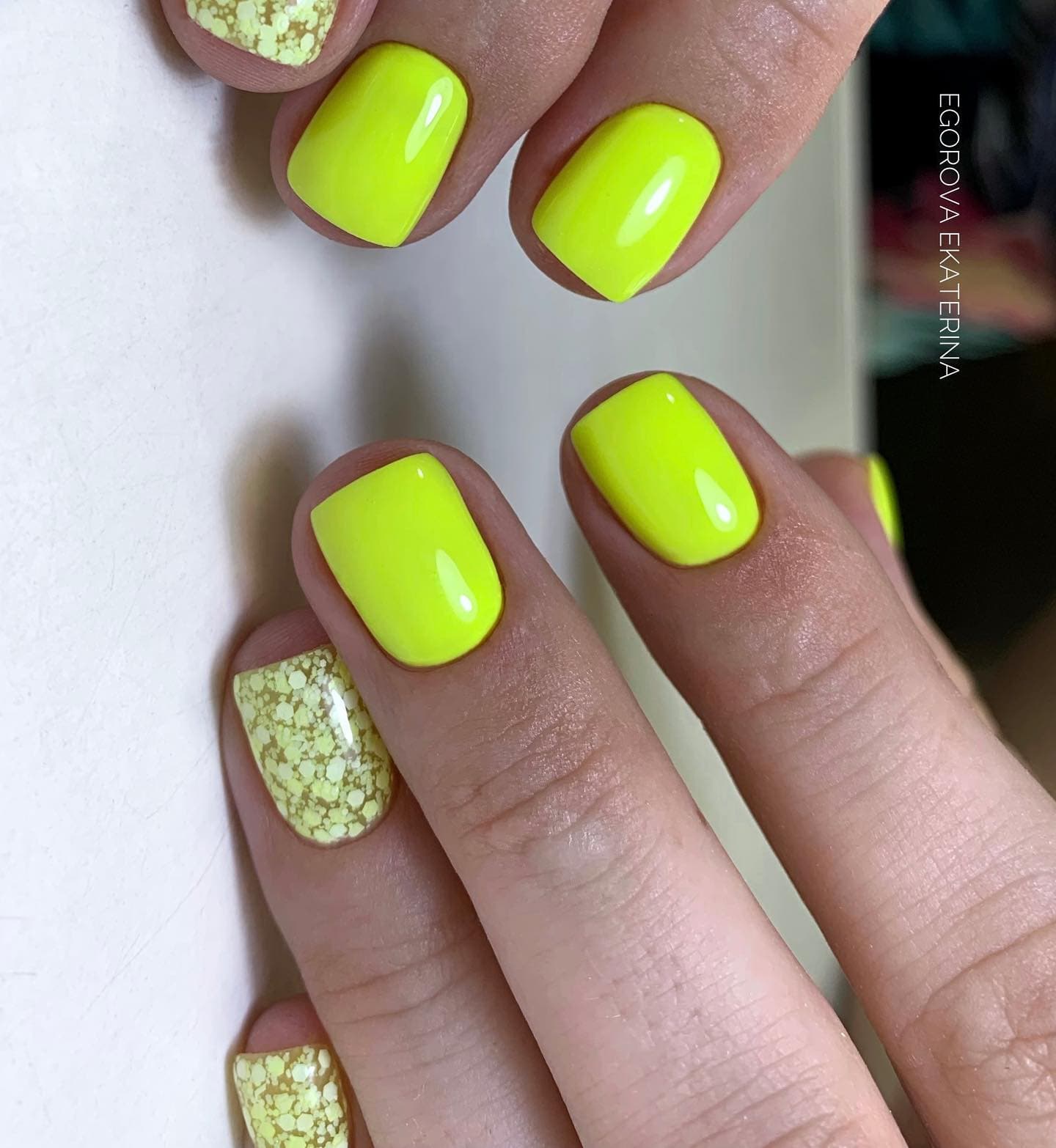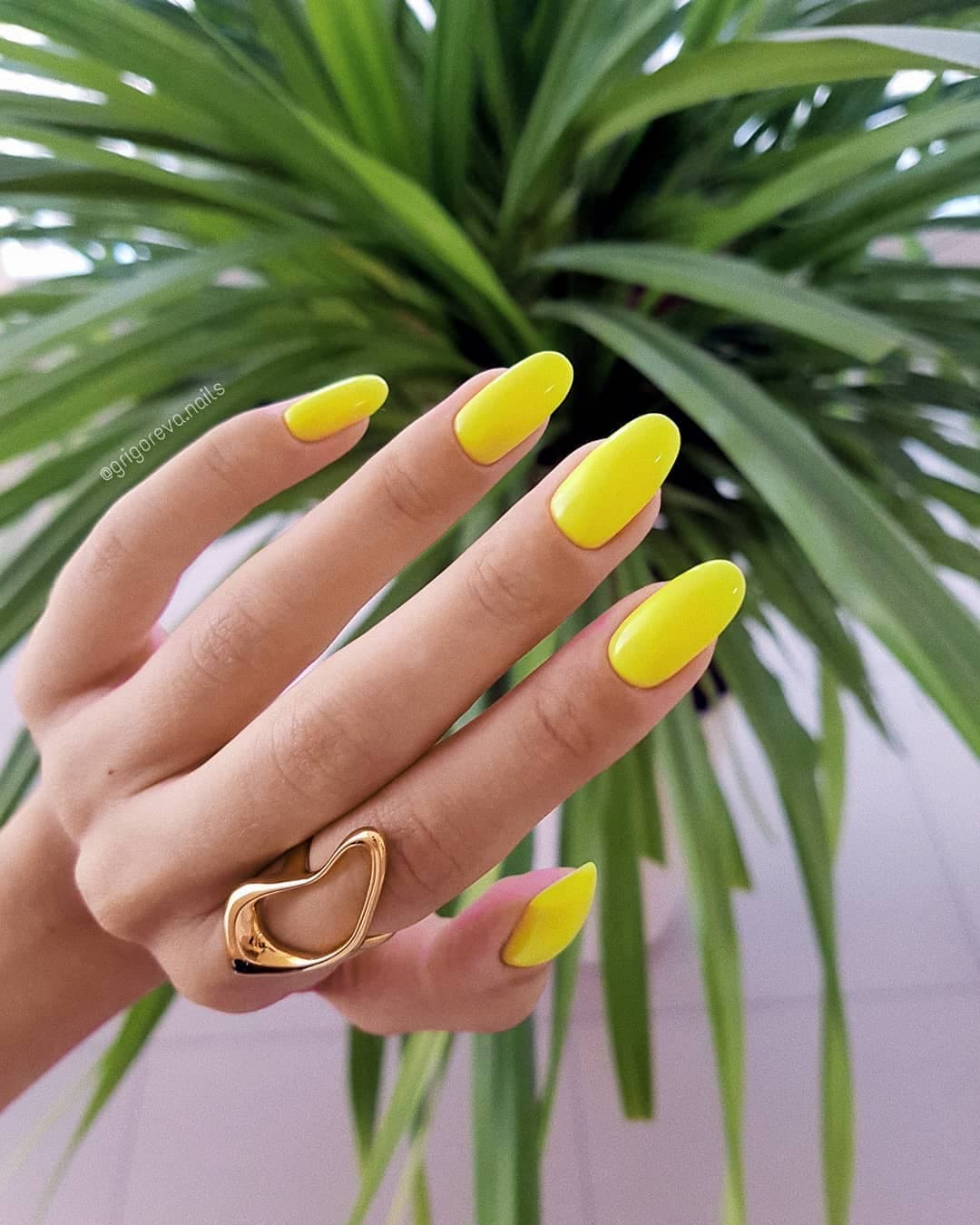 Неоново-желтый цвет как нельзя лучше подойдет к загару. Светящиеся частички усиливают пигмент кожи, подчеркивают бронзовый цвет и визуально разглаживают кожу. Если ты ищешь вариант желтого летнего маникюра 2024, такой — однозначно тренд.