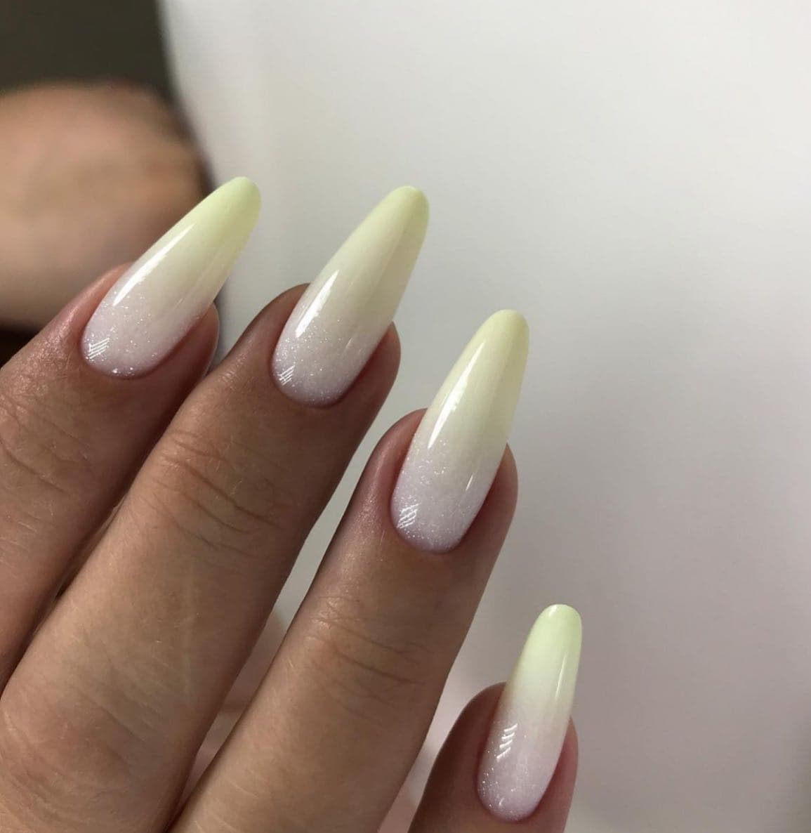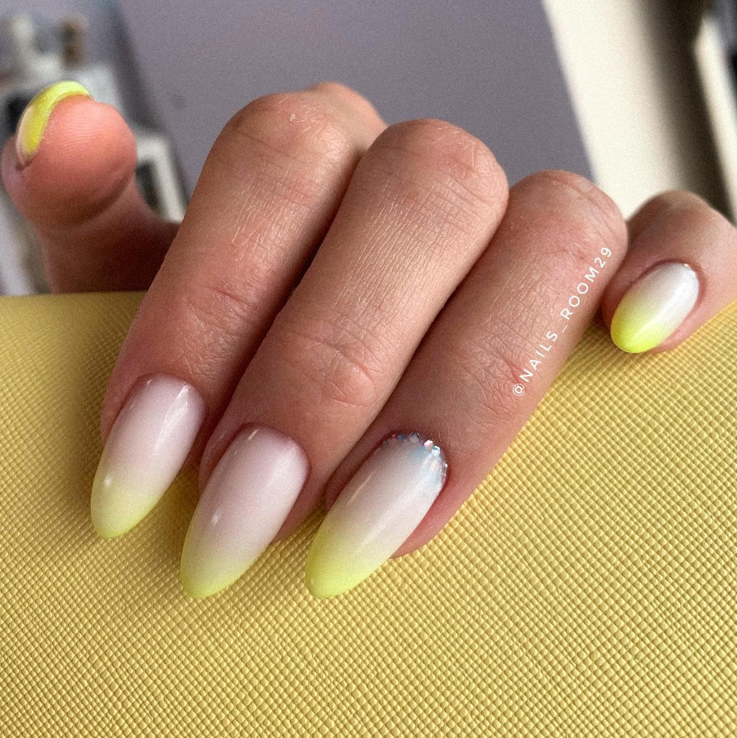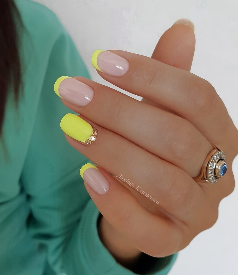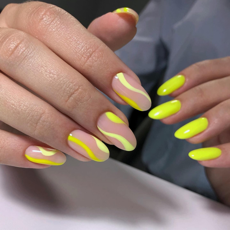 Неоново-желтый цвет как нельзя лучше подойдет к загару. Светящиеся частички усиливают пигмент кожи, подчеркивают бронзовый цвет и визуально разглаживают кожу. Если ты ищешь вариант желтого летнего маникюра 2024, такой — однозначно тренд.