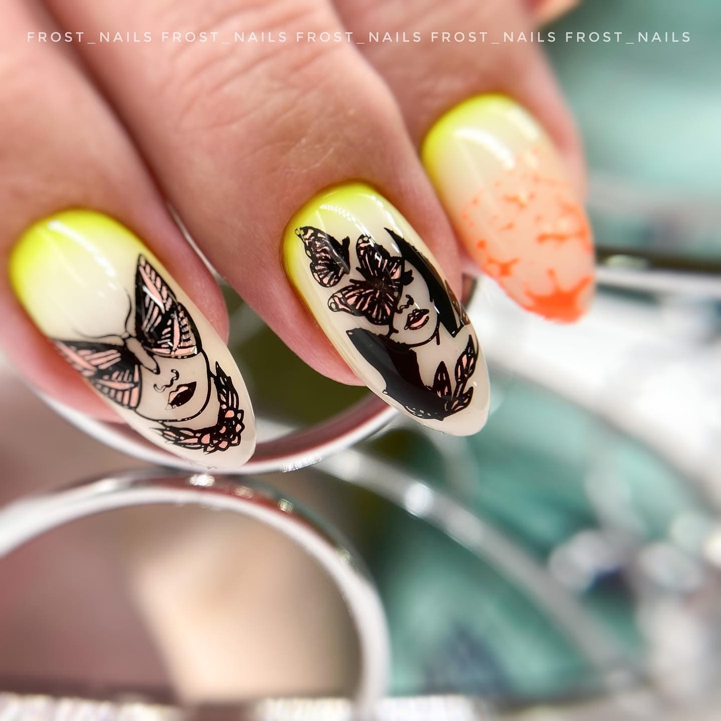 - очаровательный градиентный переход в монохромном или разноцветном исполнении. Можно наносить на отдельные пластины продольно или по горизонтали, а также создавать переход оттенков от пальца к пальцу;