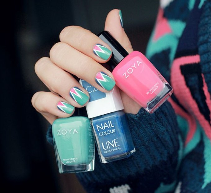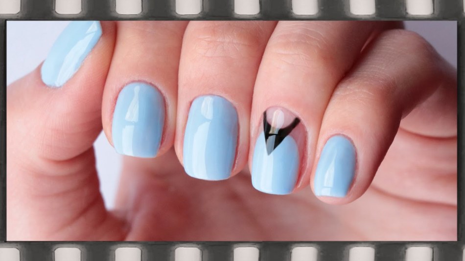 Новинка маникюра с лунками в виде треугольника. Три цвета лака отлично сочетаются в одном нейл-арте.