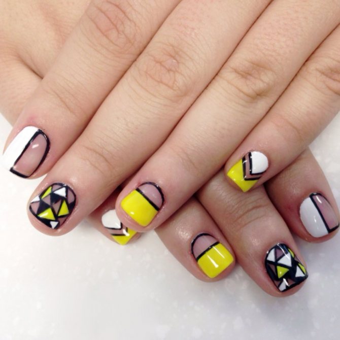 Что касается декора, то на квадратных ногтях отлично смотрятся любые нейл-арты, в которых присутствуют геометрические формы и линии. Сама форма предполагает использование строгих и лаконичных узоров. Создавайте на квадратных ногтях стильный геометрический маникюр, дизайн с ромбами, с треугольниками в технике минимализм.