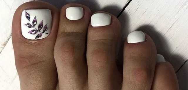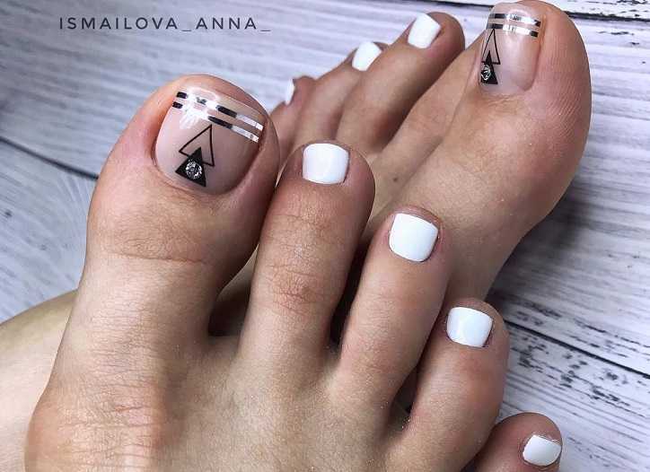 Это идеальный вариант для тандема с красивыми туфлями и нежным платьем. Также актуальны стразы, но их не стоит добавлять в большом количестве. Нейл-мастера рекомендуют располагать декор на большом пальце ноги — интересно будет смотреться какой-то незамысловатый узор, выложенный из маленьких стразиков.