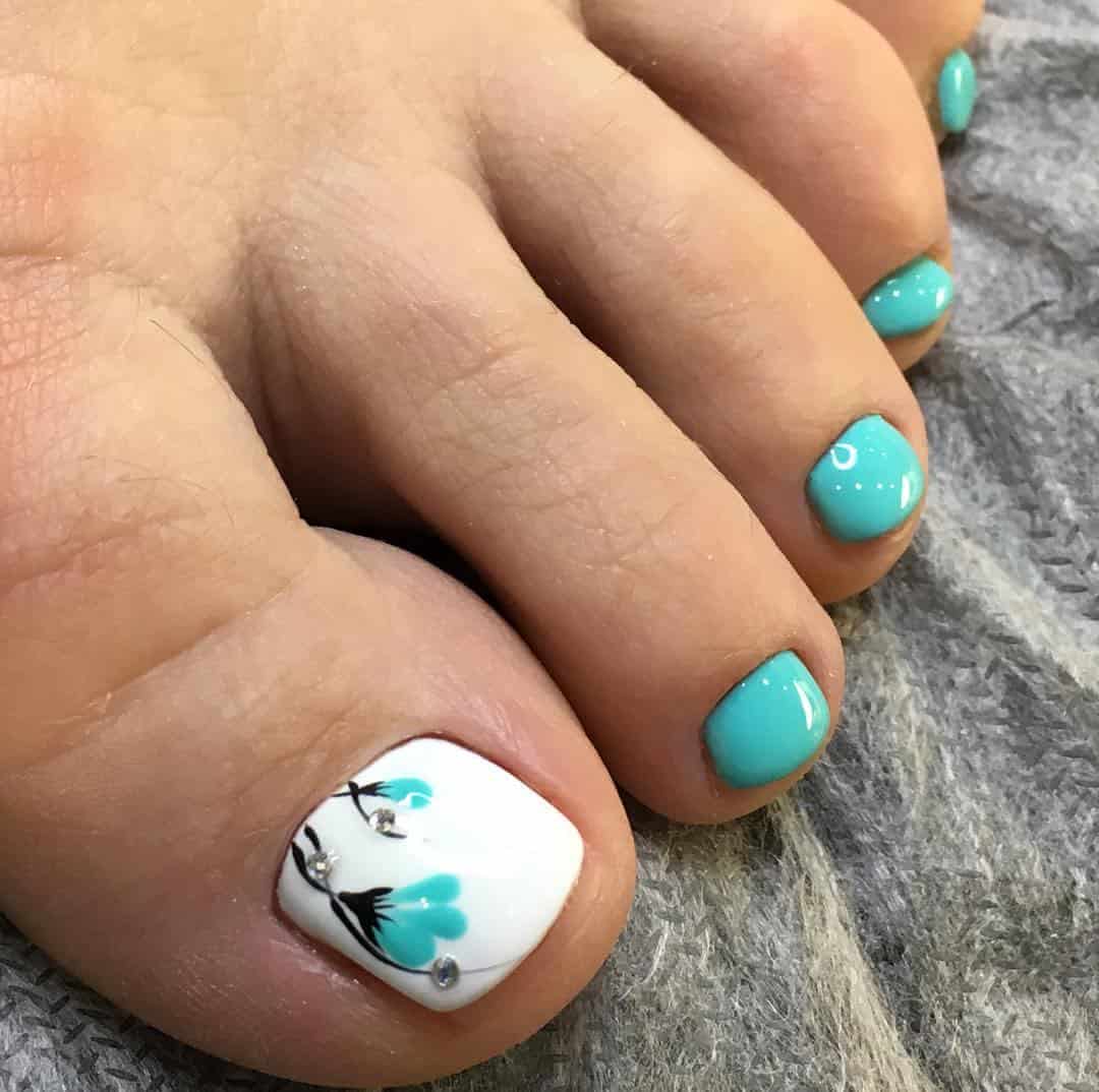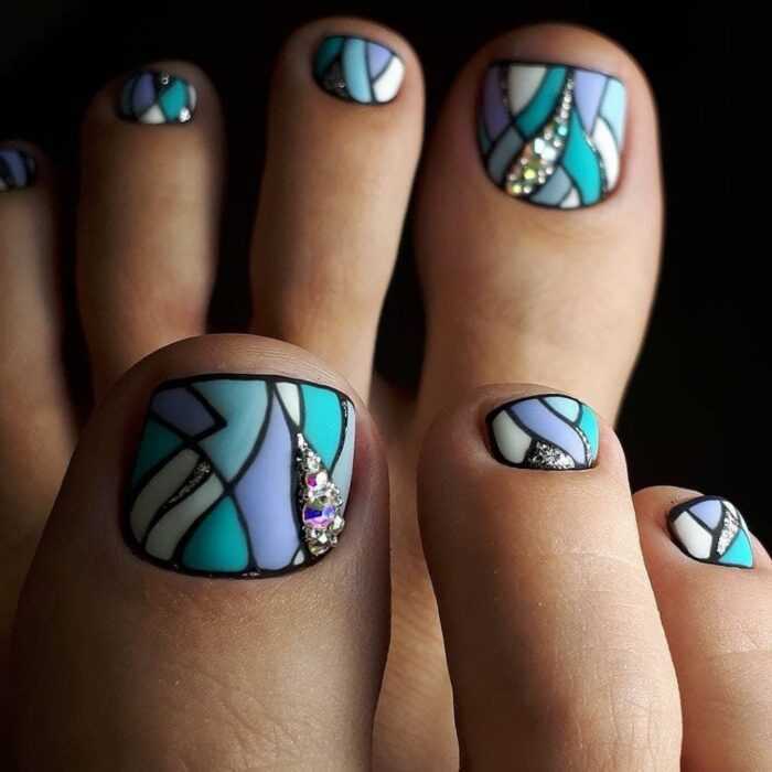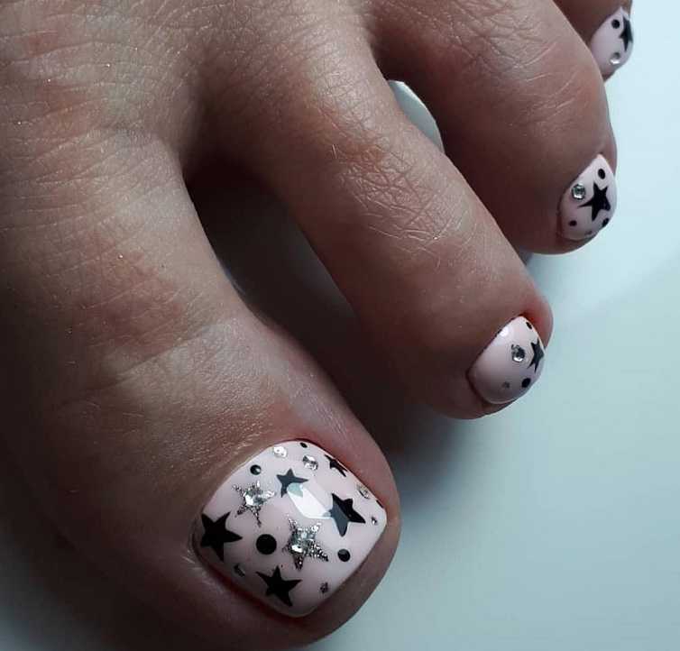 Также актуальны стразы, но их не стоит добавлять в большом количестве. Нейл-мастера рекомендуют располагать декор на большом пальце ноги — интересно будет смотреться какой-то незамысловатый узор, выложенный из маленьких стразиков