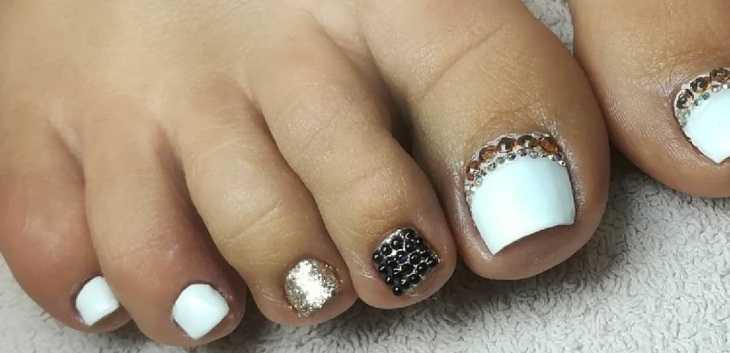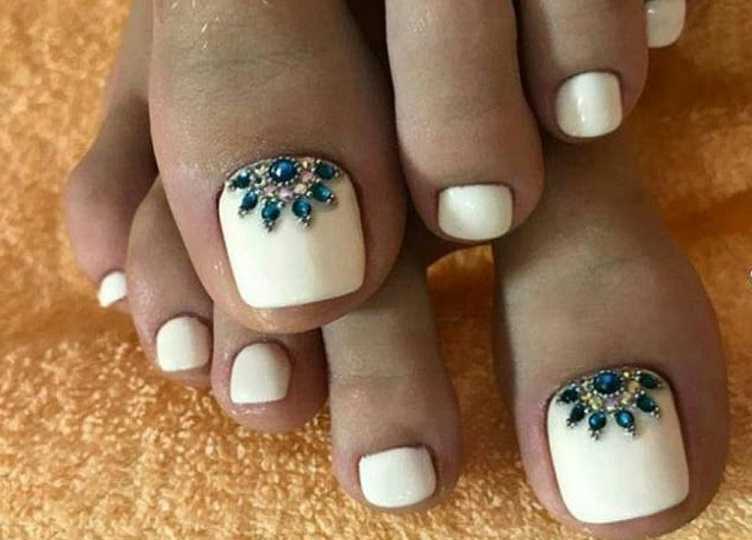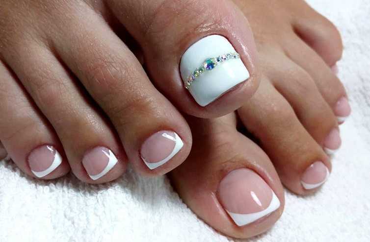 Обязательно обратите внимание на белый педикюр со стразами. Стразы дополнят и выгодно подчеркнут ваши ухоженные ноги. Существует несколько вариантов использования страз