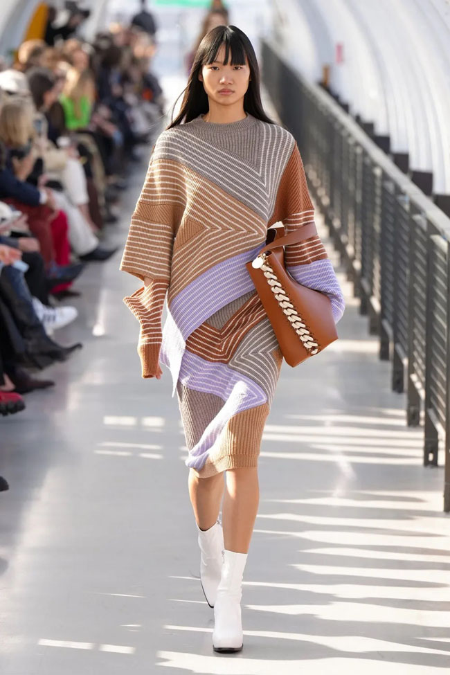 Трикотаж. Совмещены в формате total look: длинные платья, комплект из свитера и юбки, две вещи, состоящие из топа и брюк.