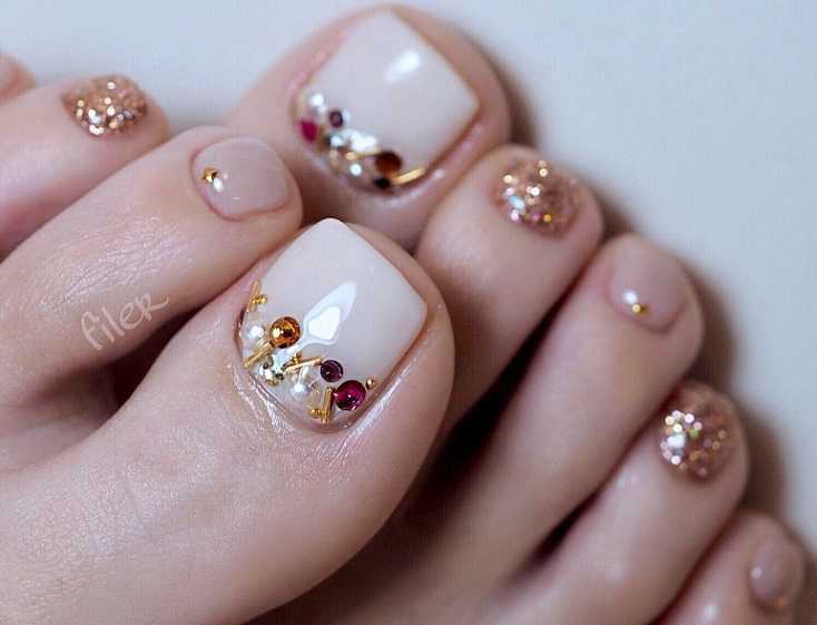 Если вы хотите создать более яркий и праздничный дизайн, стоит обратить внимание на блестки. С ними ваш нюдовый педикюр приобретет очень стильный вид. Это идеальный вариант для тандема с красивыми туфлями и нежным платьем