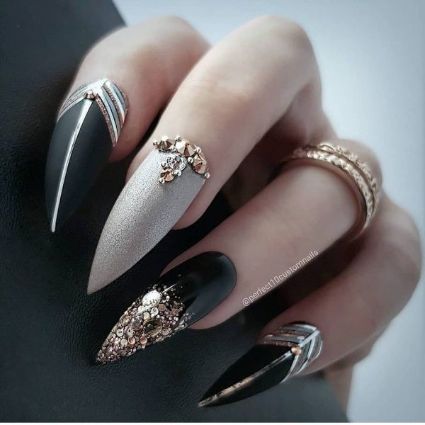 Сделайте черный острый дизайн ногтей осень-зима 2024-2025 с металлическими полосками, глиттерным гель-лаком, камушками, выложенными на одном или нескольких ноготках, золотистыми и серебряными конфетти.
