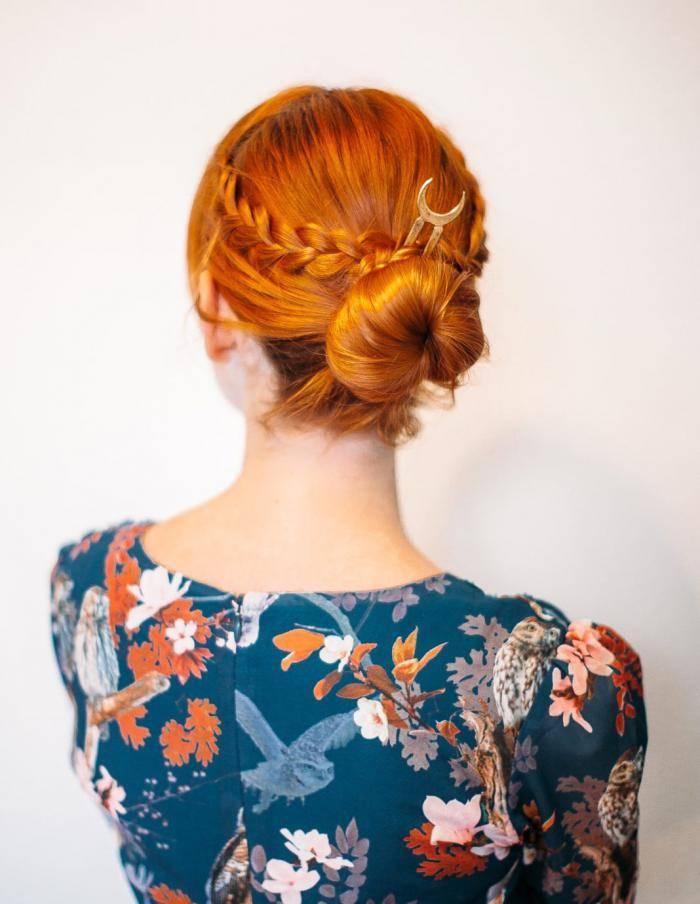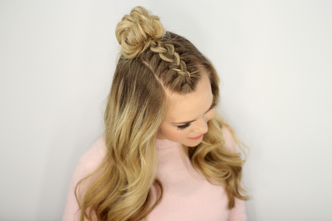 Еще один топовый вариант прически с косой на длинные волосы – узелок. Суть такого плетения в том, что волосы остаются распущенными. Косу начинают плести с лобной части и ближе к затылку формируется своеобразный пучок-узелок. Такой вариант идеален как для рабочей обстановки, так и для прогулок с друзьями. Одинаково хорошо будет смотреться с романтичным платьем или же с одеждой в стиле кэжуал.