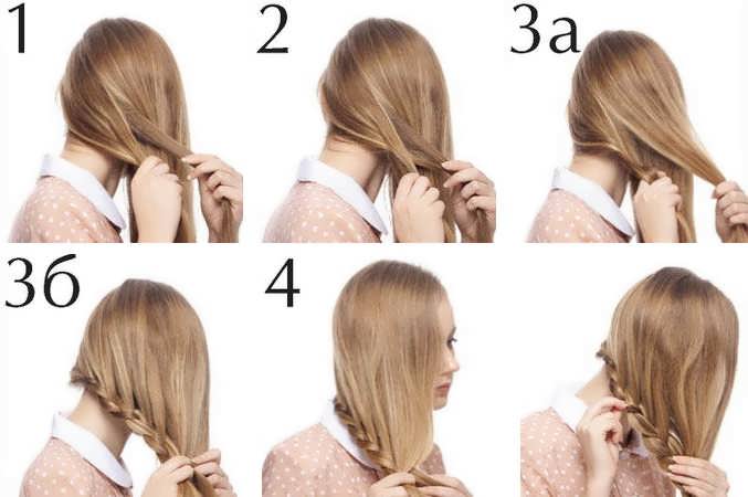 Сделать оригинальную простую прическу своими руками сейчас не представляет никакого труда. Обилие средств для стайлинга, различных аксессуаров и заколок для волос позволяет нам творить что угодно на своей голове и создавать за 5 минут прически хоть на каждый день, хоть вечерние. Длина волос тоже особой роли не играет. Хотите заплести косу на короткие волосы. Пожалуйста! Используйте маленькие силиконовые резиночки, которые надежно зафиксируют пряди и они не разлетятся в течение дня. Принцип плетения смотрите на фото ниже.