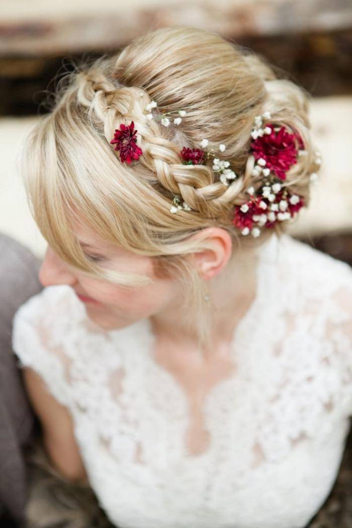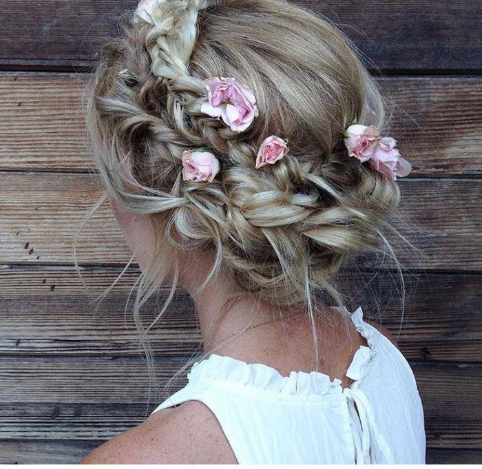 На светлых волосах выигрышно смотрятся две французские объемные косы, которые снизу переходят в элегантный пучок, закрепленный заколками или шпильками.