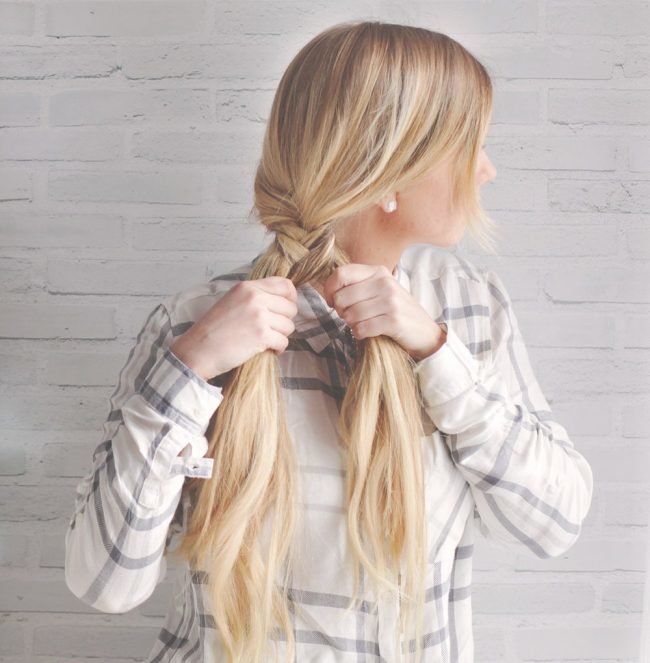 - От левой пряди с края отделяется прядка и перекидывается в центр, соединяясь с правой прядью;