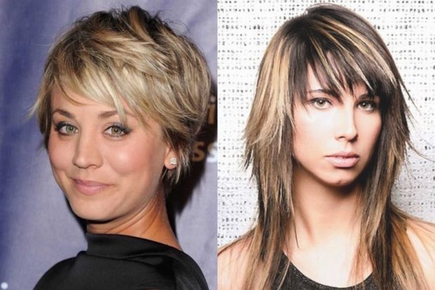 Из стрижек и причесок будут уместны объемные, волнистые и кудрявые. Каскад, асимметрия и многоуровневые прекрасно подкорректируют ситуацию, но при этом помогут сохранить длину волос. В случае с асимметрией длина волос может быть частично сохранена, но именно данный вариант лучше других позволит играть с овалом лица, удлиняя или закругляя его.