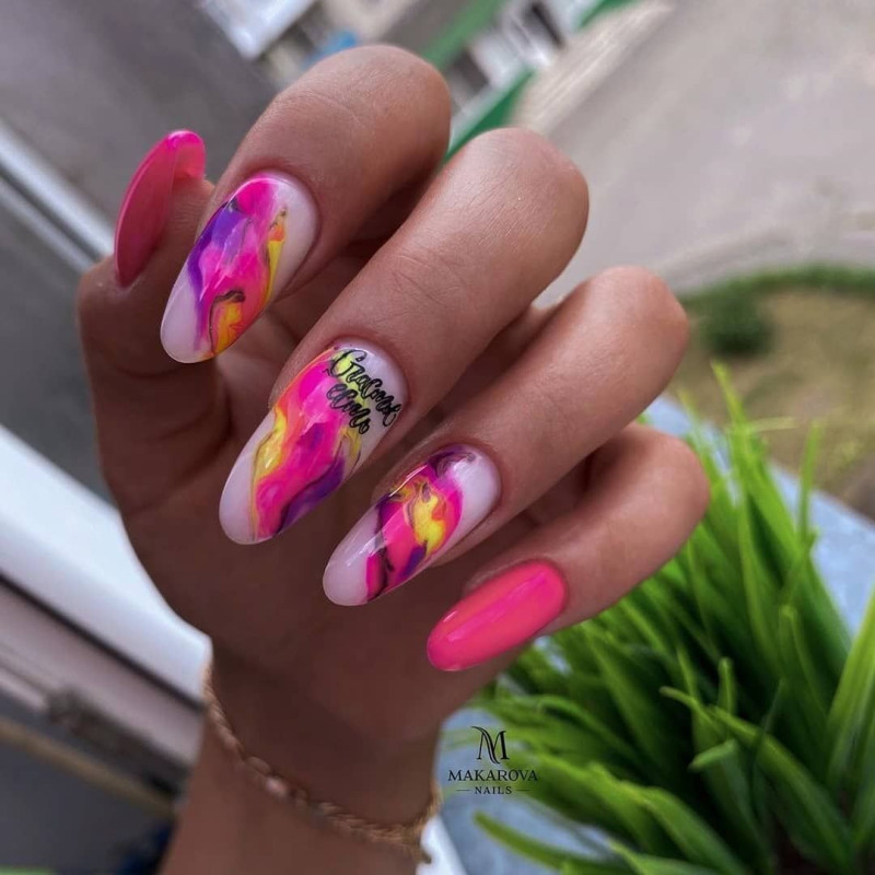 маникюр весна-лето с надписями на большом, указательном, двух или трех ноготках одновременно