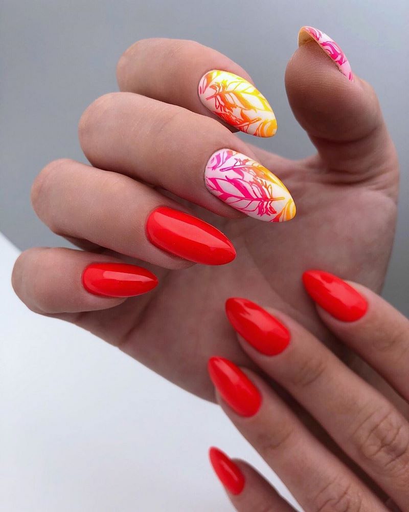 Есть множество способов привлечь к себе внимание, но самый проверенный — бескомпромиссный красный цвет. Единственное, лучше выбирать красно-оранжевый оттенок. Он поможет выделить красоту рук