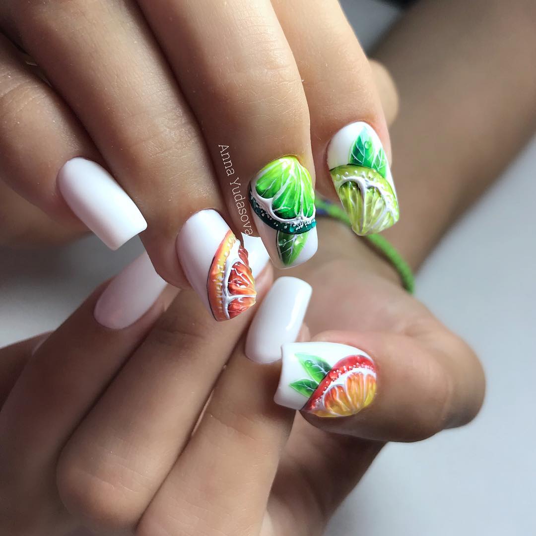 Летом фантазия nail-мастеров начинает играть всеми красками. Ведь лето — это самое солнечное и самое прекрасное время года. Поэтому и в дизайнах — главными составляющими будут летние мотивы. Это и летние ягоды и фрукты — арбузы, ананасы, кокосы, бананы, клубника, малина и вишня. Это и летние цветы и бабочки, и морские пляжи с пальмами и дельфинами. И конечно же, разноцветный летний френч.