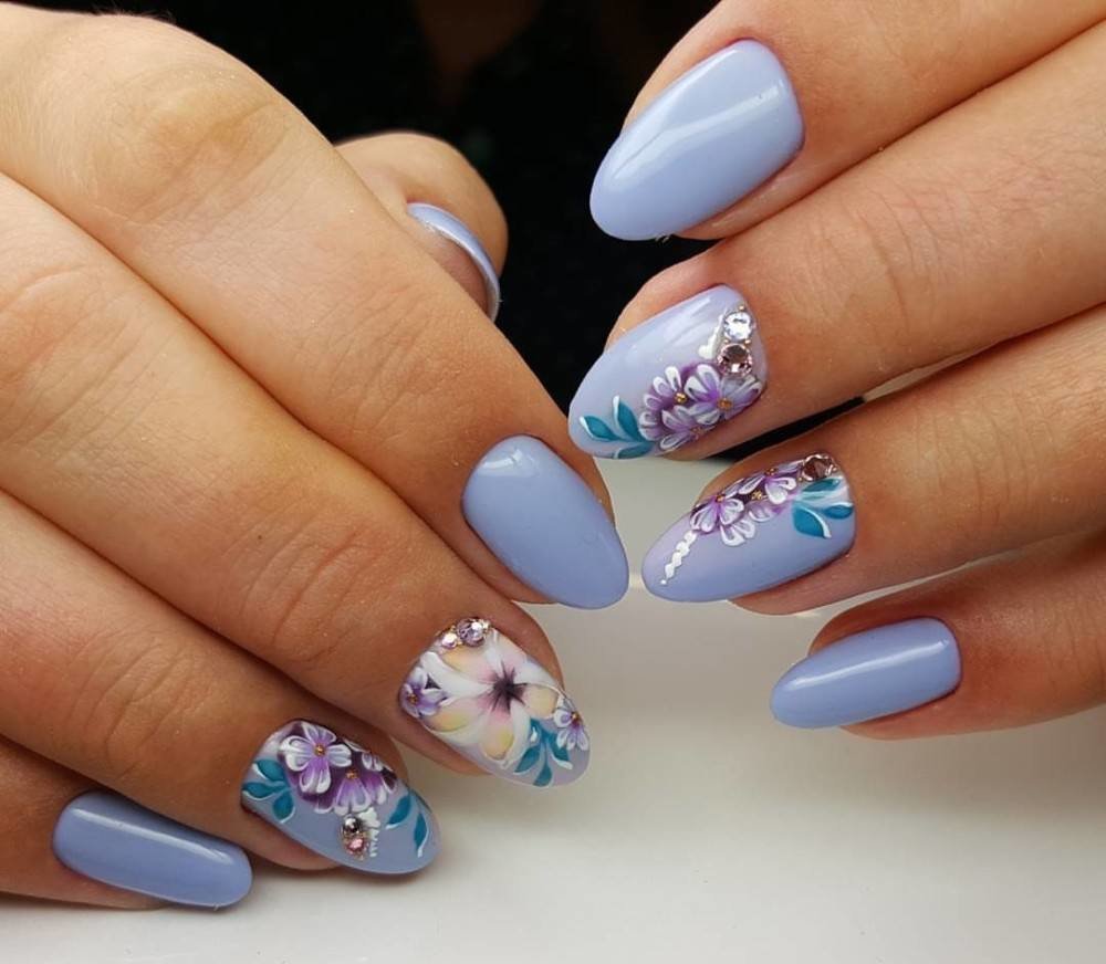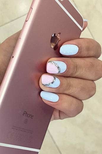 Если вы ищете интересные идеи с фото для маникюра на коротких ногтях на весну и лето, обратите внимание на все оттенки голубого, но в пастельной гамме. Ориентиром станет незабудковый или небесный тон