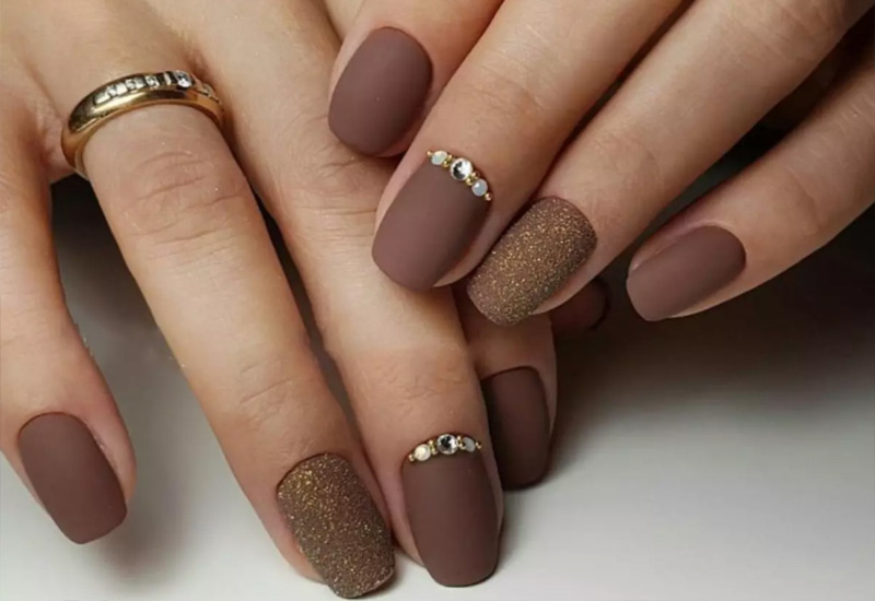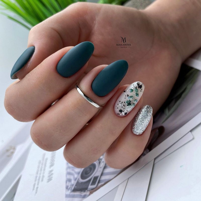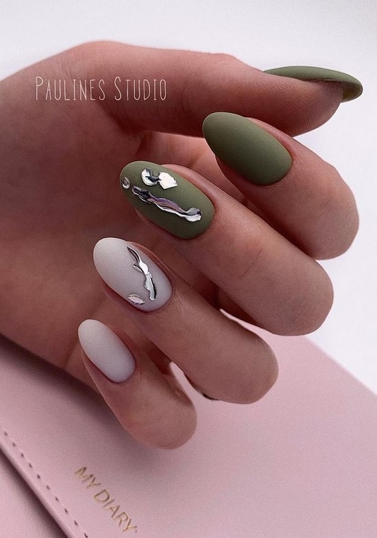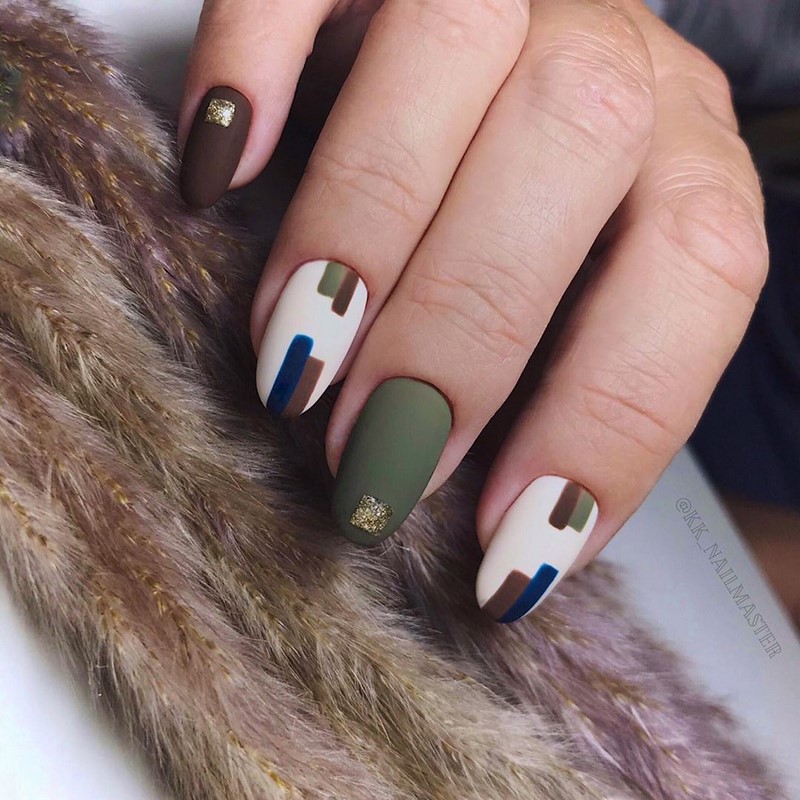 Такая смесь темно-зеленого, коричневого и серого оттенков отлично подойдет, как для повседневного, так и вечернего маникюра. Для второго варианта стилисты рекомендуют использовать яркие декоративные элементы в виде блесток, перламутра и страз, чтобы придать дизайну праздничности.