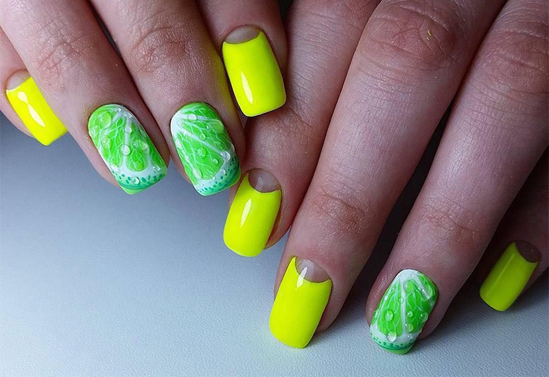 Среди модных тенденций маникюра на весну и лето – сочные цитрусовые тона и акценты. Вы можете покрыть ногти изображениями апельсинов или цветков флердоранжа на ярком фоне. Но лучше попробуйте неожиданный многоцветный маникюр, смешав оттенки лайма, лимона, апельсина, мандарина и помело в смелом сочетании, чтобы удивлять и восхищать окружающих. А френч с цветными кончиками станет более мягким вариантом оформления на каждый день.