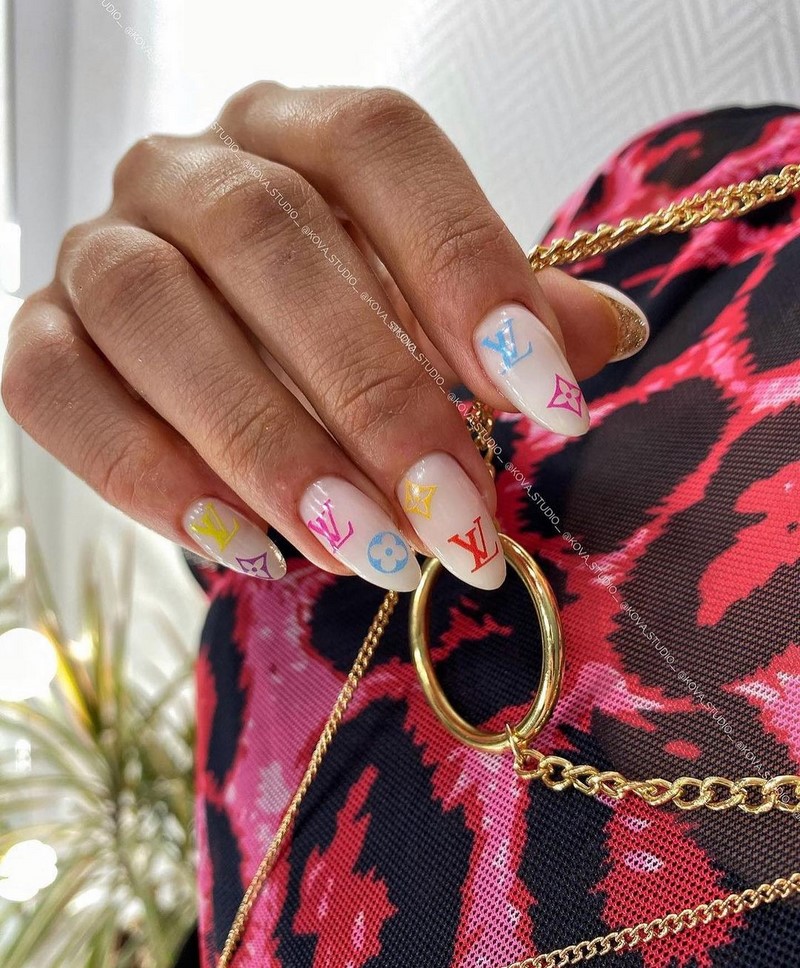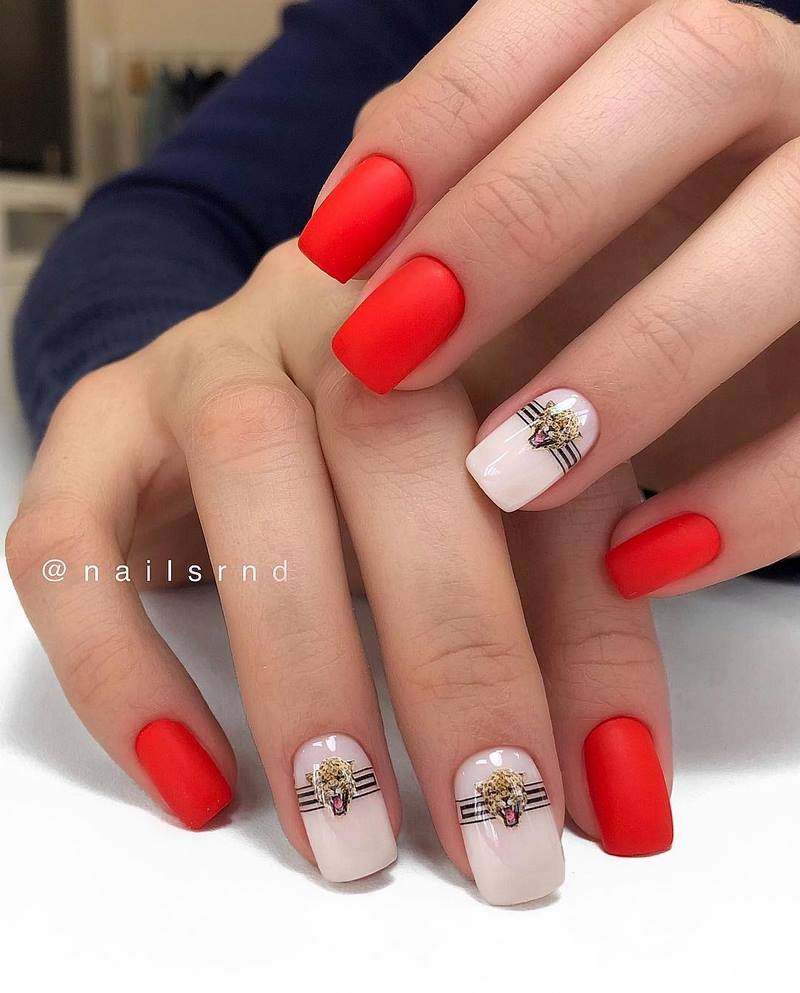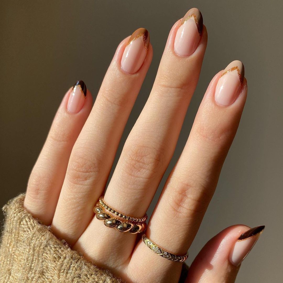 в 2021 году актуально смешивать модные цвета в одном маникюре – красный с золотым и черным, синий с зеленым, оранжевый с желтым: