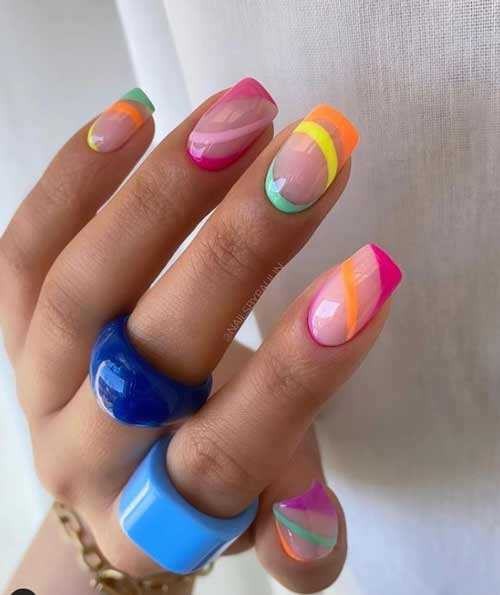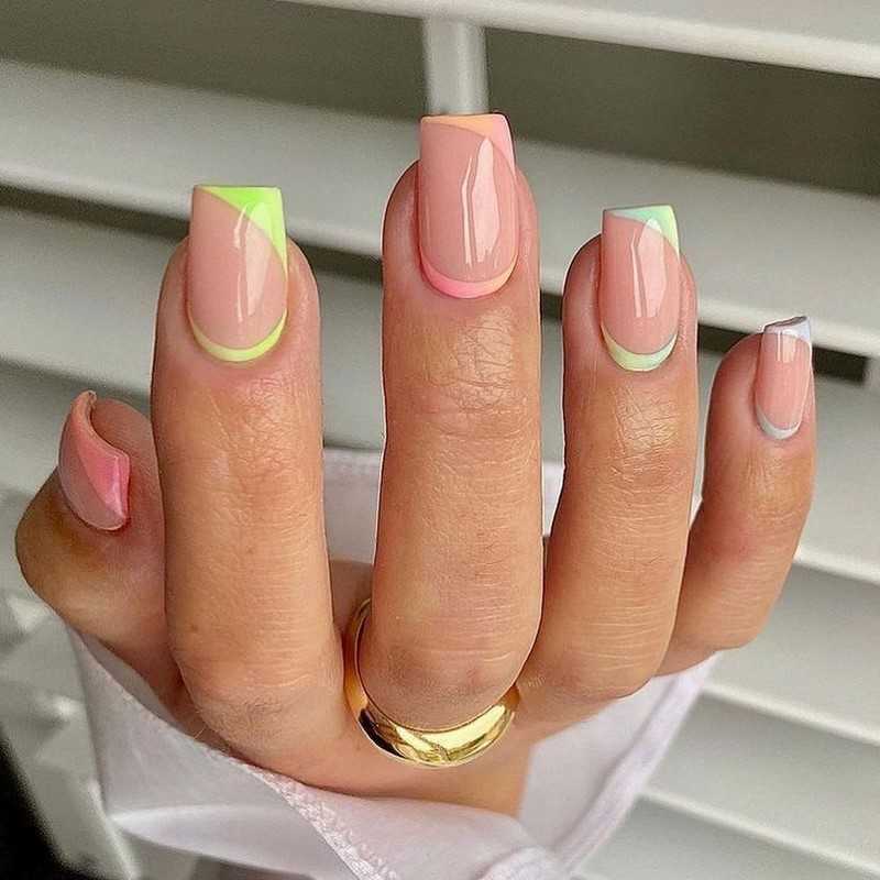 - Пастельная основа с полосками ярких расцветок, тянущихся до луночек.