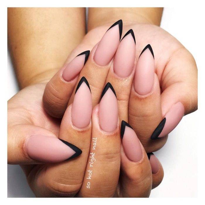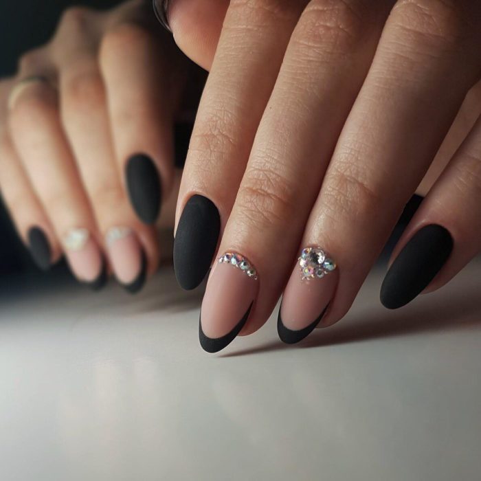Еще одним самым популярным вариантом френча является матовое или глянцевое черное покрытие ногтей с блестками или негативным пространством. Линия улыбки также может быть выделена с помощью втирки или глянцевого топа.
