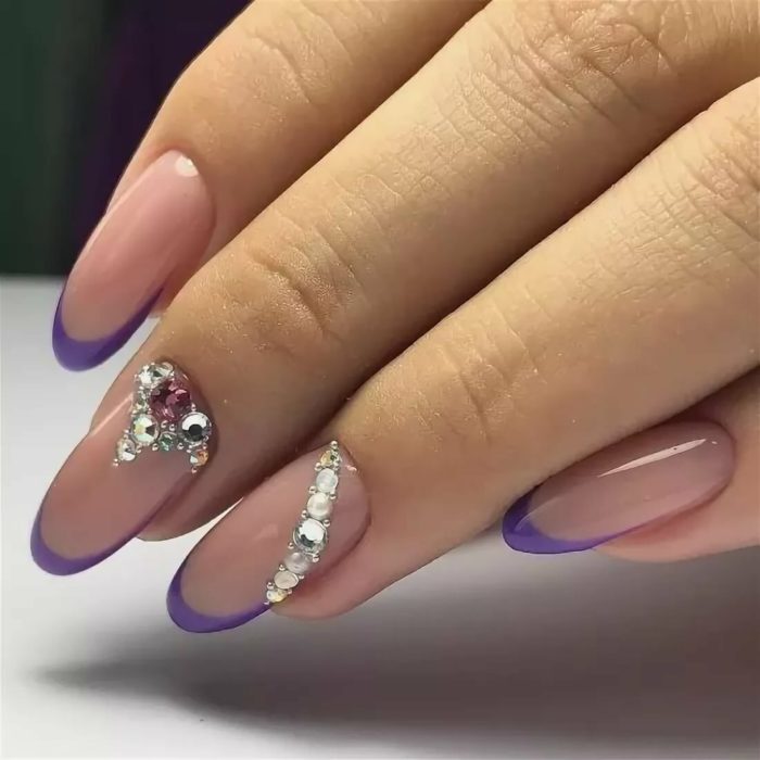 Новинок достаточно много: мармелад, камифубуки, чешуя, разнообразные металлизированные пигменты, блестки ,витражные лаки, гель-лаки с эффектами и т.д. Сейчас у nail-мастеров просто невероятное разнообразие инструментов для создания самых интересных и необычных вариантов маникюра, в том числе френча. Разработано множество техник, которые смело сочетают в одном дизайне, делая комбинированный маникюр. Увлекательное разнообразие ярких камушков, блесток и наклеек притягивает, как магнит и заставляет постоянно работать безграничную фантазию мастеров по маникюру. Начнем обзор свежих вариантов дизайна френч с уже полюбившейся новинки – новой формы дизайна ногтей со стразами – инкрустацией.