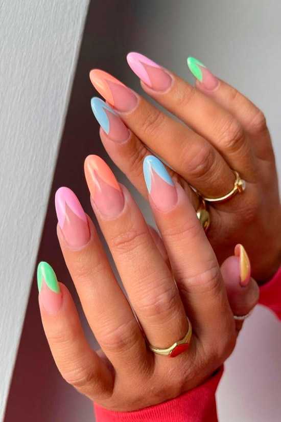 Ниже представлены фото новинки в дизайне ногтей 2022 года: цветной френч