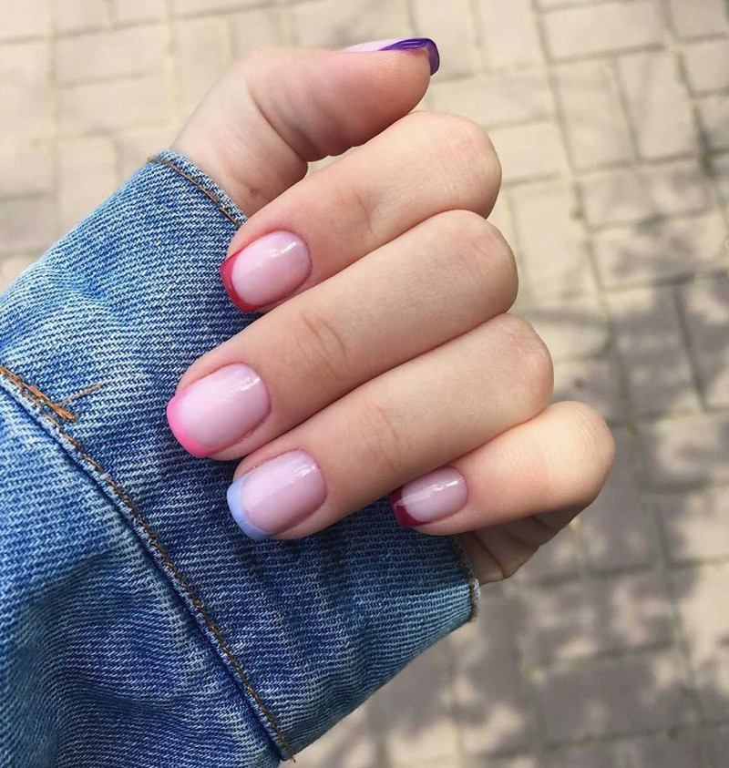Модные идеи для дизайна французского маникюра на лето представлены в широком спектре. Цветной вариант будет смотреться неординарно и креативно. Ограничений в выборе оттенков нет. Такое оформление ноготков будет очень востребовано в сезон весна-лето этого года.