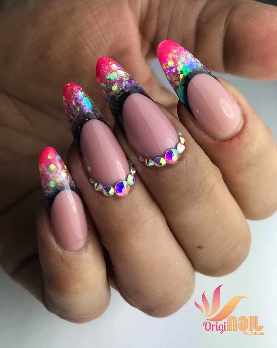 - Используйте блестки для того, чтобы украсить основание ногтя, а не его окантовку.