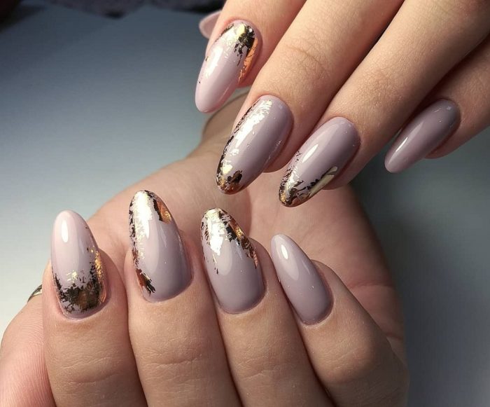 - Вместо блестящей пудры или лака нанесите на кончик ногтя переводную фольгу. Благодаря этой технике, получится стильный металлический эффект. Кстати, отлично смотрится такое решение в том случае, если сама ногтевая пластина окрашена темным лаком. Хочется нежности? Отчертите тонкой фольгированной полоской линию улыбки.