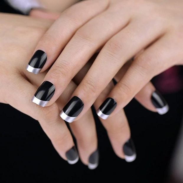 Черный френч подойдет деловым дамам. Он выглядит элегантно и строго. Лучше всего смотрится на квадратных ногтях средней длины. Молодежь часто разбавляет такой дизайн стразами или рисунками в виде звездочек. Тогда маникюр приобретает более жизнерадостный вид.